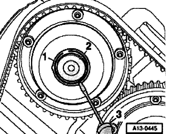 Note: Thrust washer -3- is only installed on toothed belt gear with part number 06C 105 063. -No thrust washer must be installed for toothed belt gear with part number 06C 105 063 B.