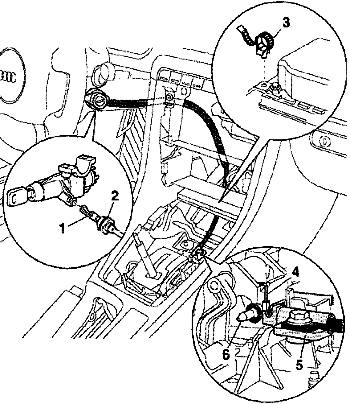 - Lift locking spring -4- for interlock cable, pull interlock cable support bracket -5 sideways out of sniff mechanism and disengage interlock cable eye.