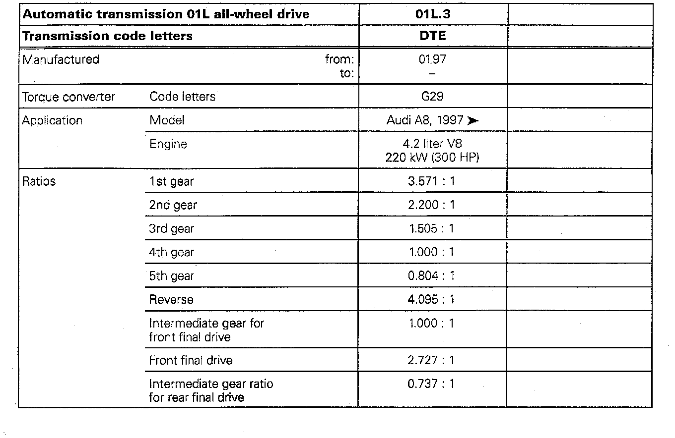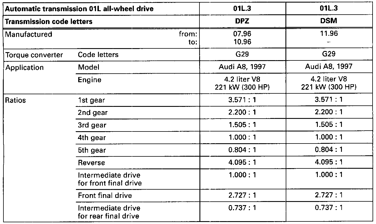 - The 5-speed automatic transmission 01L is installed in the Audi A8 in combination with the 4.2 liter V8 engine.