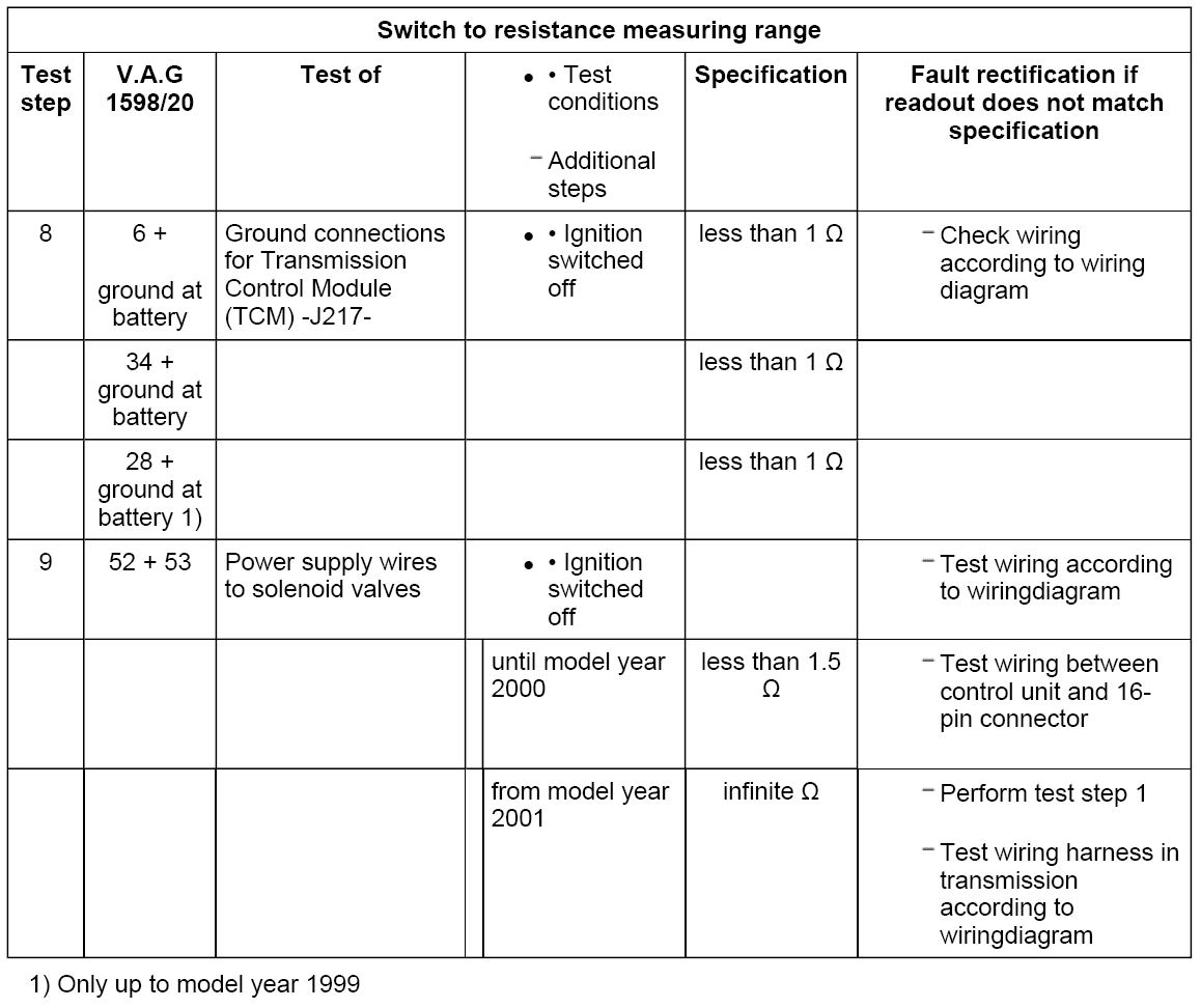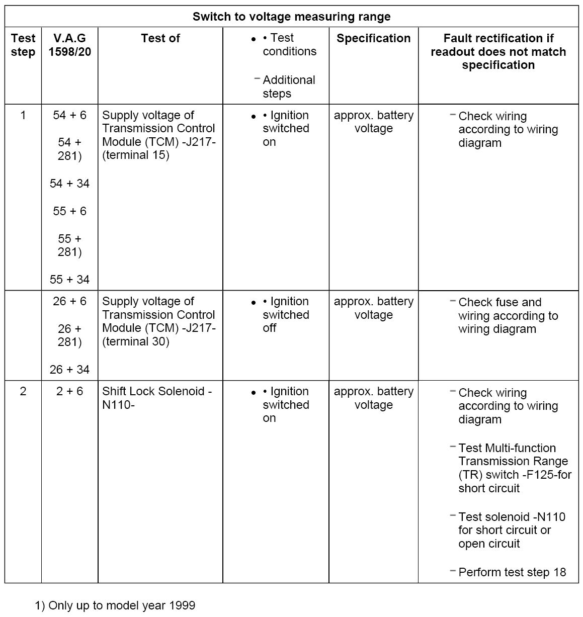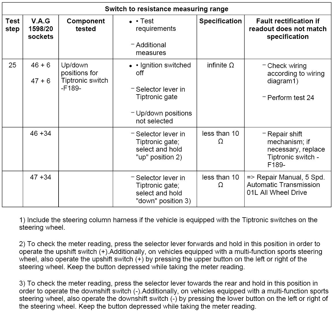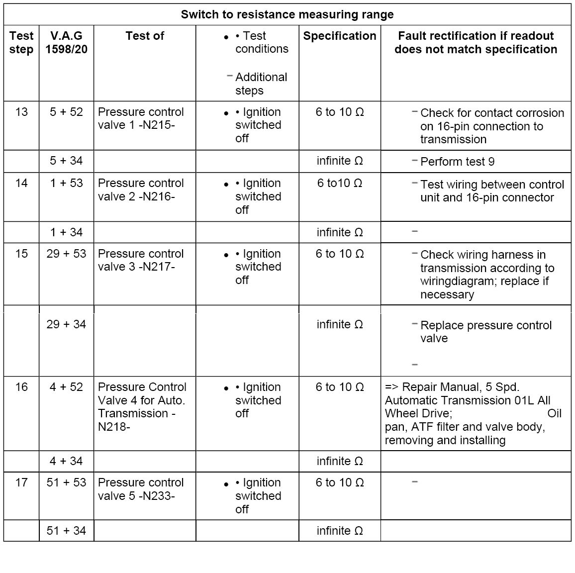 5 Speed Automatic Transmission 01L All Wheel Drive On Board Diagnostic (OBD)Test TableTest Steps 1-2: