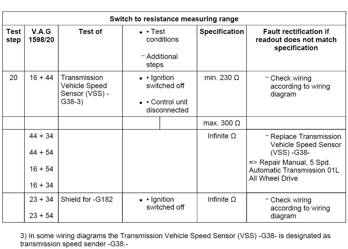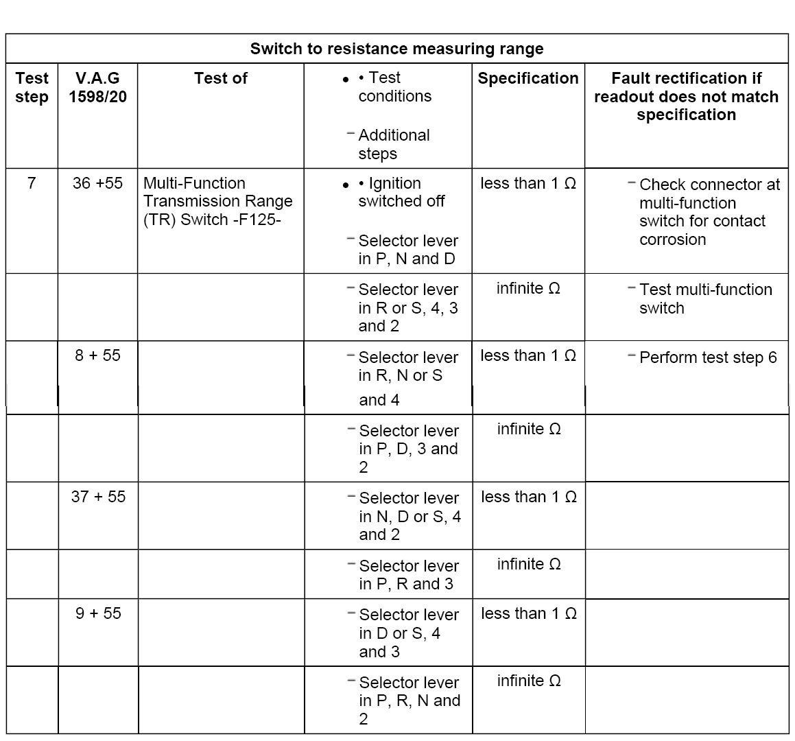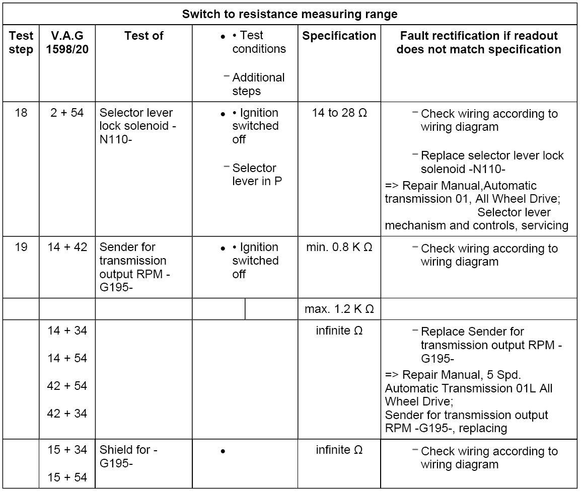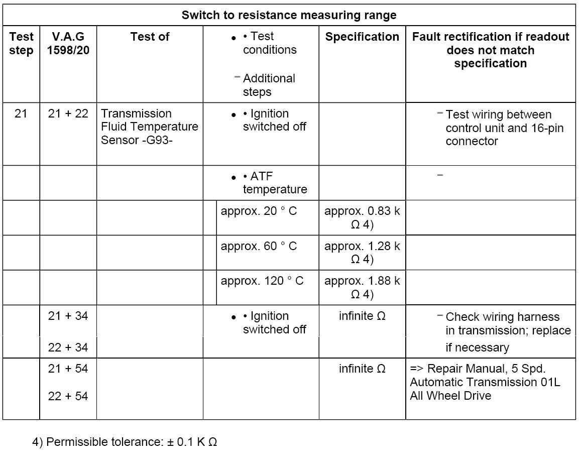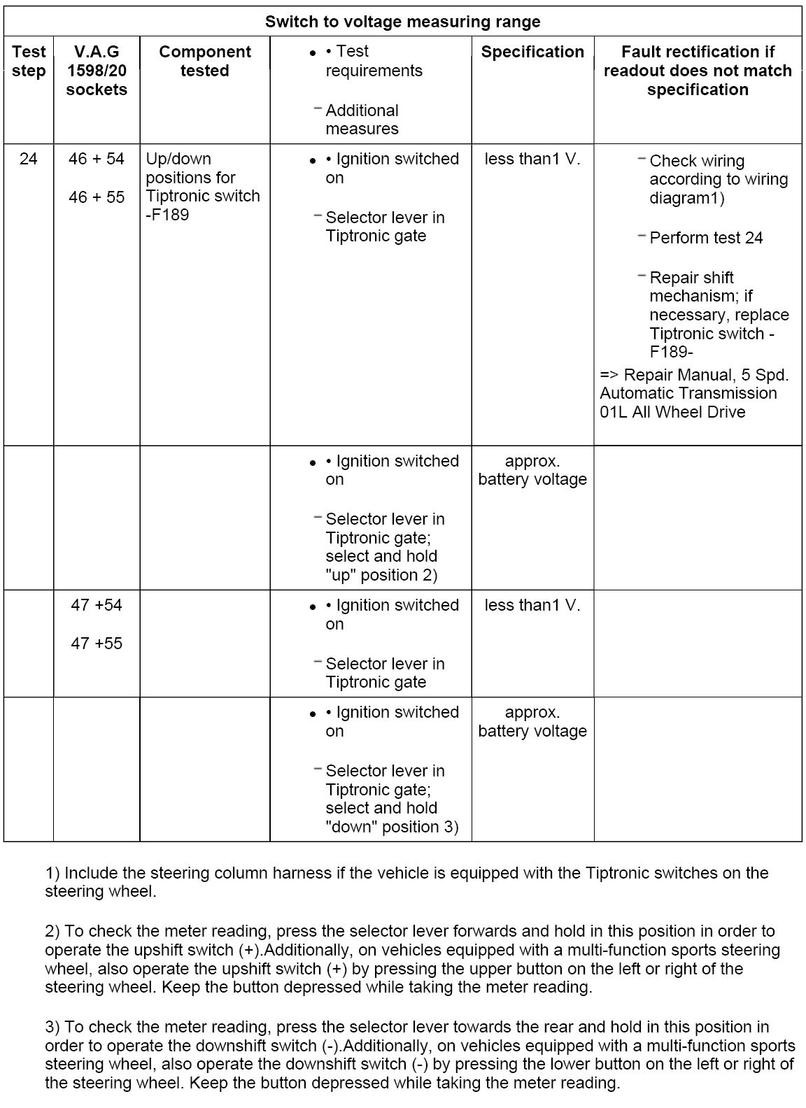 5 Speed Automatic Transmission 01L All Wheel Drive On Board Diagnostic (OBD)Test TableTest Steps 1-2: