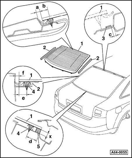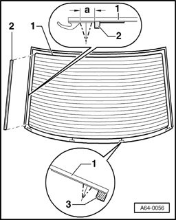 - Glue on adhesive stopper profile - 2 - at distance -a- = 10 mm (0.394 in.) from rear window seal - 1 -.