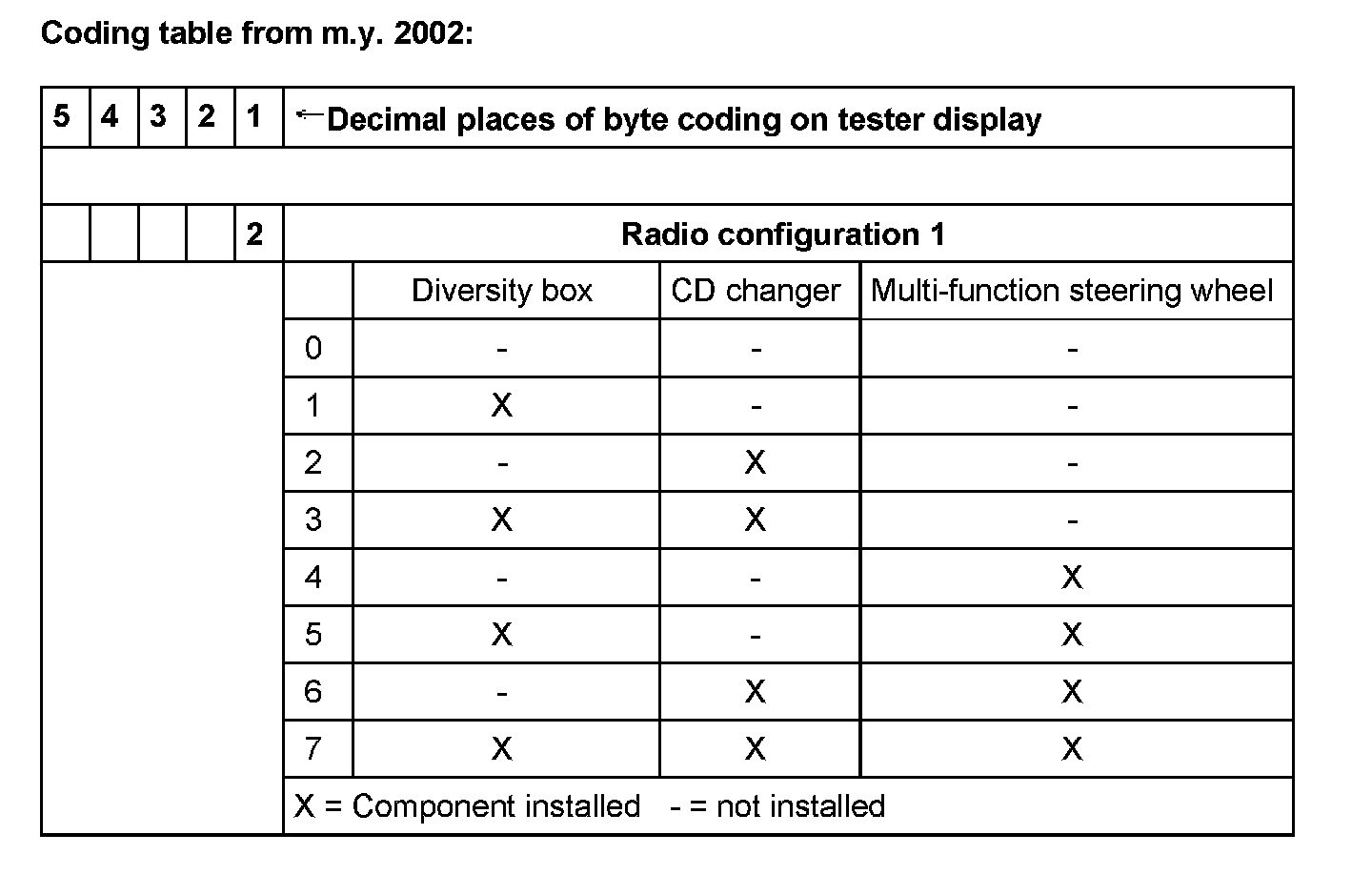 - The coding table only gives the combinations that are available for the Audi TT.