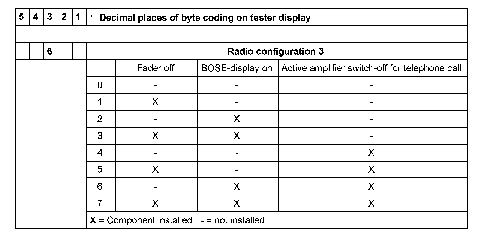 - Radio configuration 3: 6 = with Bose and active amplifier switch-off for telephone call