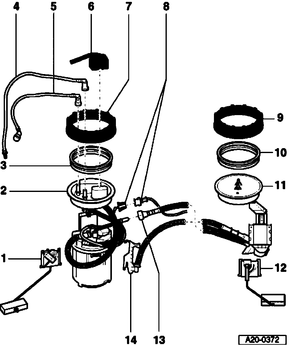 Fuel pump, Sender for fuel gauge -G- and Fuel level sensor 2 -G169-, component overview