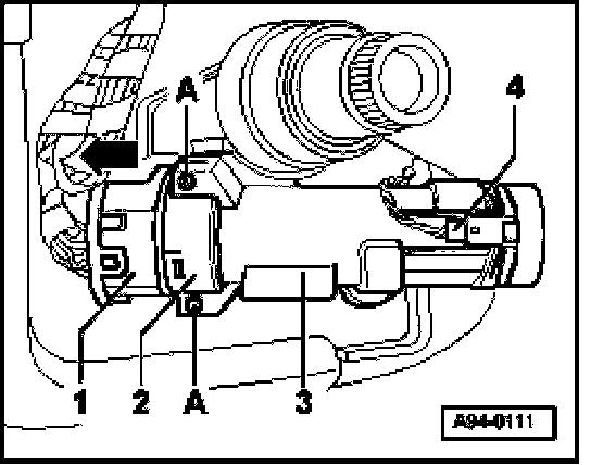 - Loosen retaining screws -A- slightly, then pull ignition/starter switch -2 out of steering lock housing -3- in direction of -arrow-.