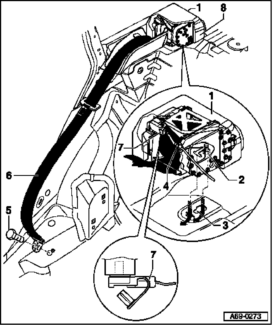 - Remove bolt -2- accessible from below on belt module/belt tensioner from luggage compartment