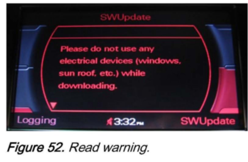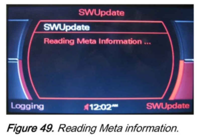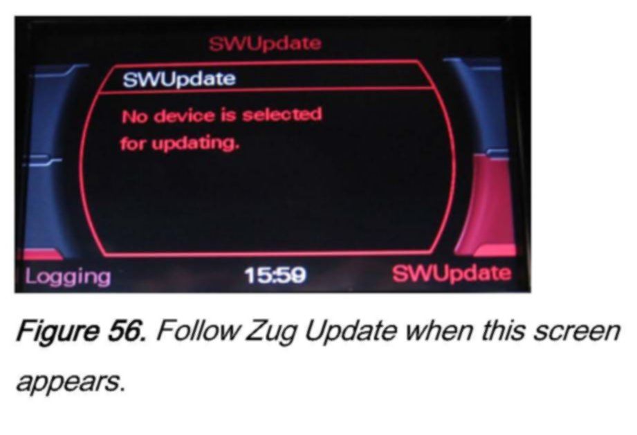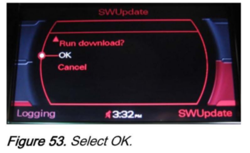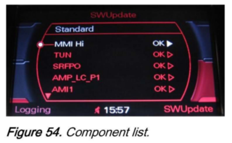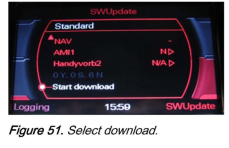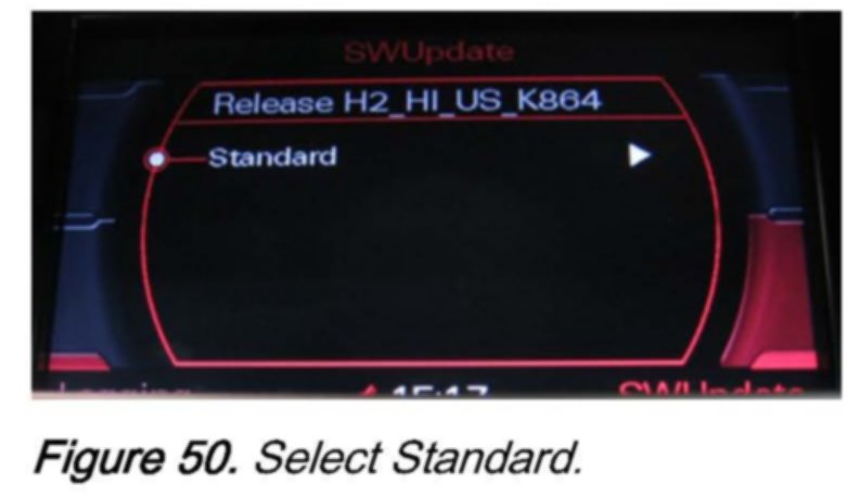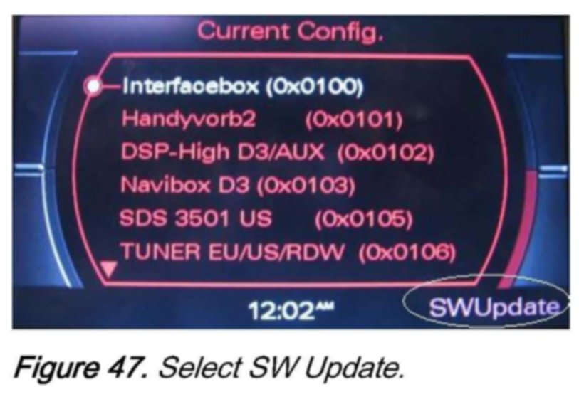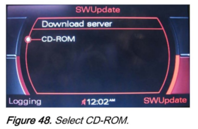 2. Wait 30-60 seconds until the MMI system recognizes the CD. Then access the red update menu (press and hold the SETUP and RETURN buttons) and select the function SW Update with the lower right soft button.
