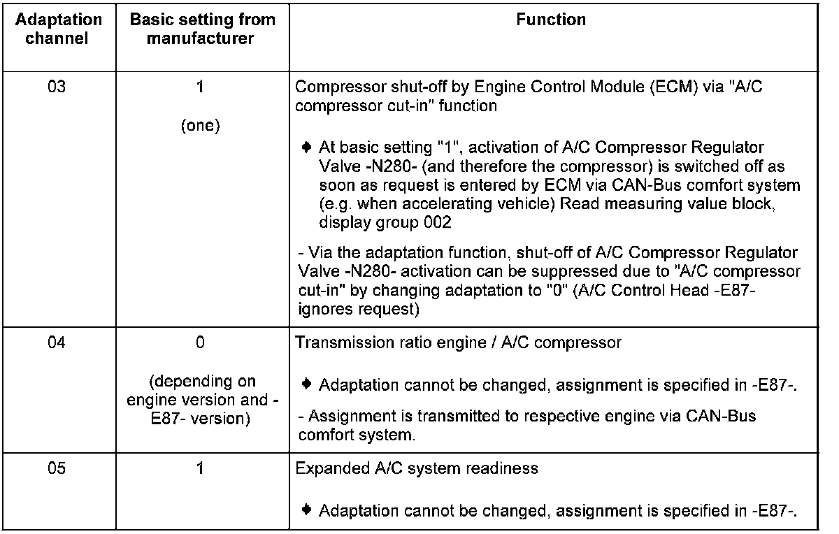 - If input "0" is entered in adaptation channel 03, it is to be noted in vehicle records that the activation of A/C Compressor Regulator Valve -N280- can no longer be shut off via the "A/C compressor cut-in" function from Engine Control Module (ECM).
