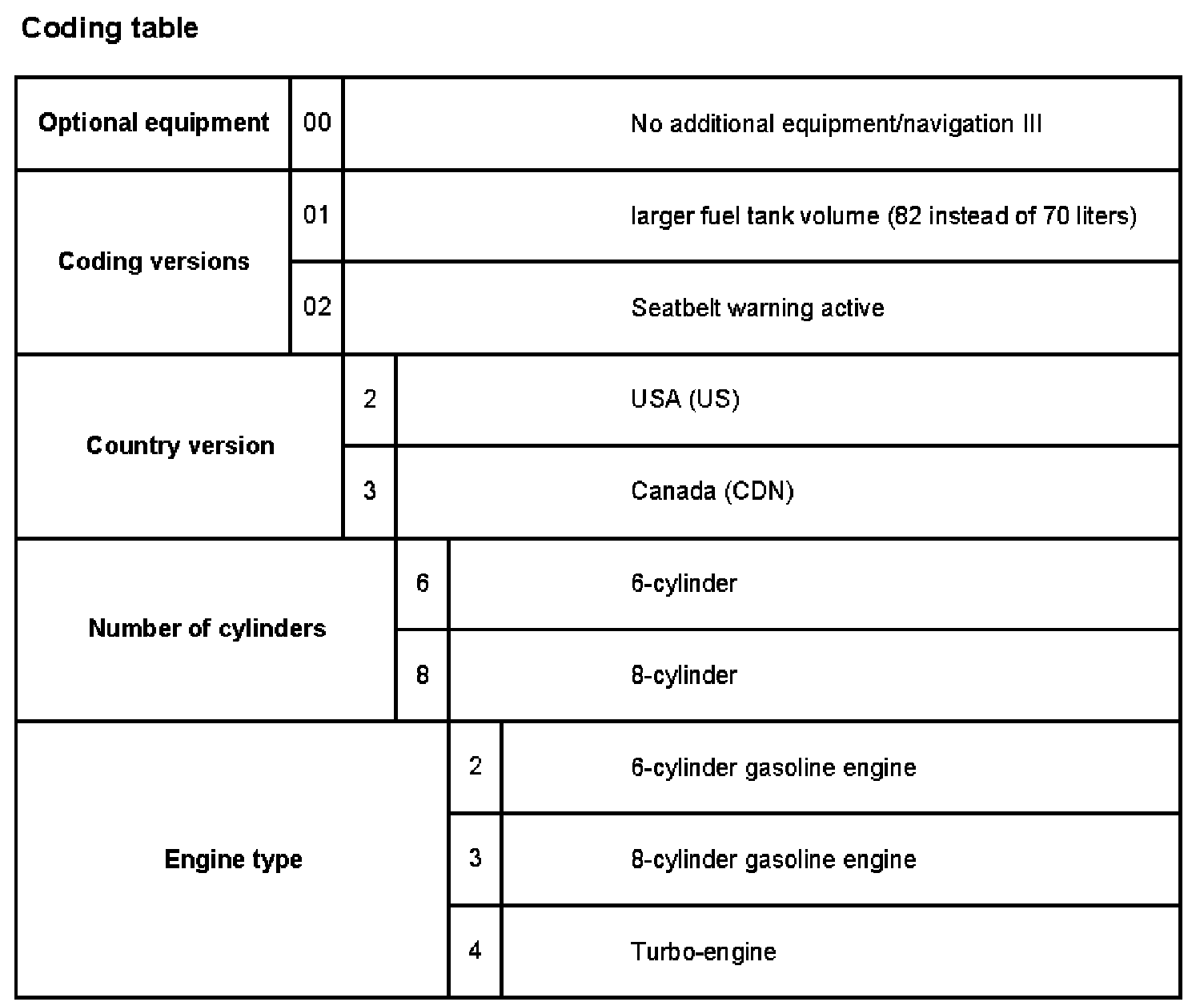 Example: Larger fuel tank volume (82 instead of 70 liters) and seat belt warning active 01 + 02 = 03