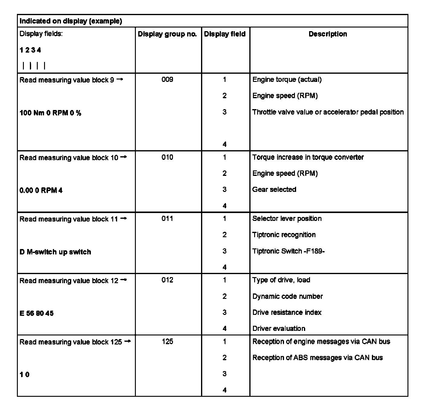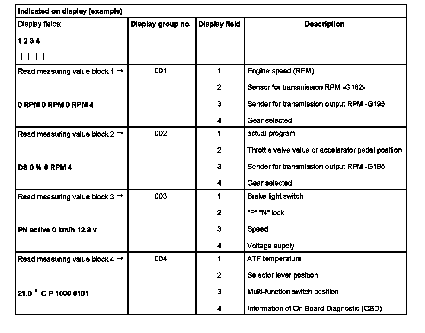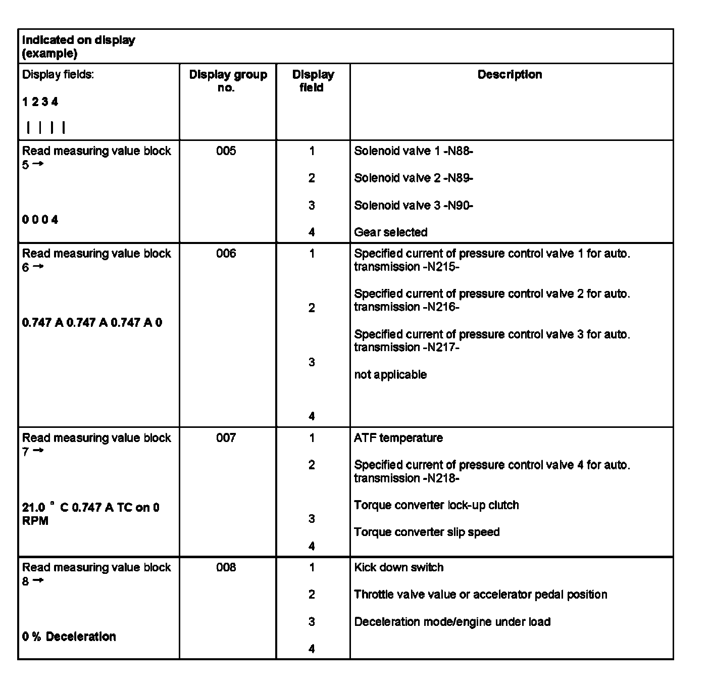 Read Measuring Value Block (scan tool function 08) for transmissions with hydraulic control E18/2