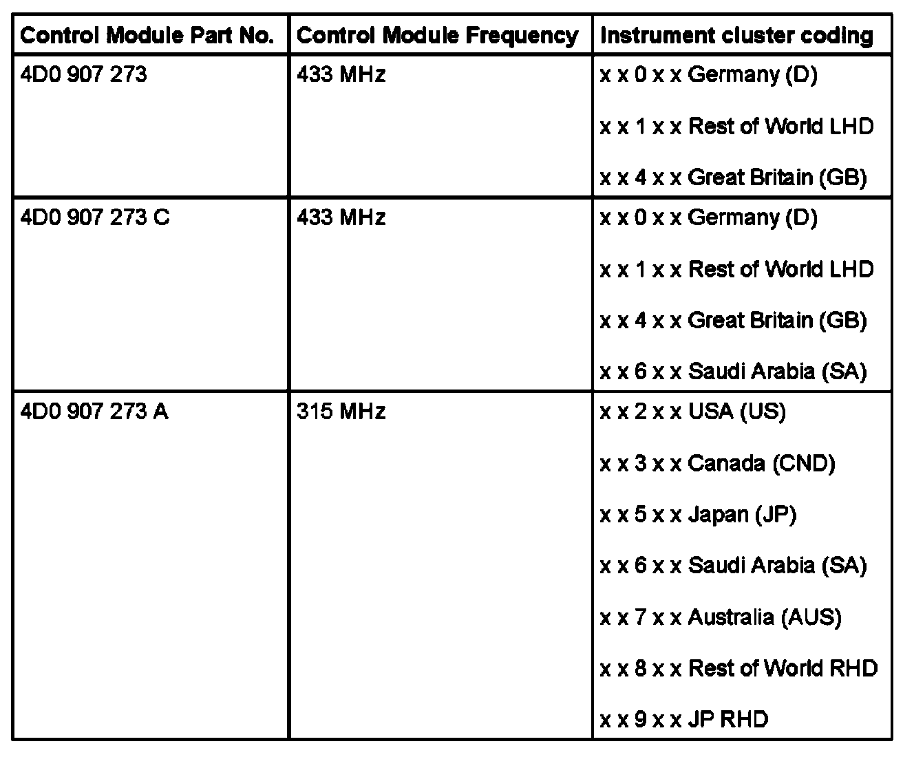 Table of Control Module Versions With Coding or Instrument Cluster