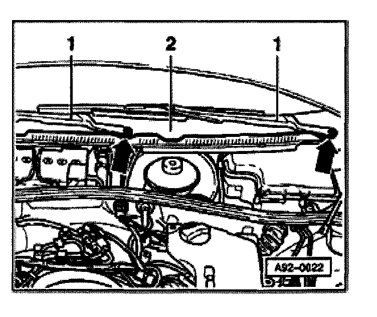 - Carefully swing wiper frame -2- upward at rear (arrows) and remove complete from plenum chamber toward right.