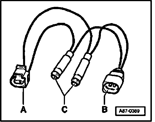 - Use can also be made of an improvised adapter cable for this test. This requires, for example, one connector -A- and -B- each (with part number 1J0 973 702 and 1J0 973 802 and the corresponding plug contacts), two commercially available sockets for banana plugs -C- and two wires with a cross-section of 0.5 sq. mm.