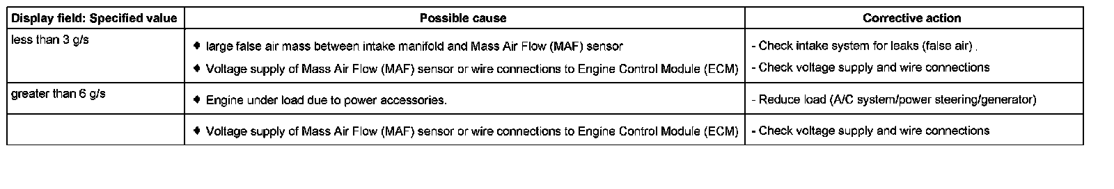 - Check specified value of air flow quantity at Mass Air Flow (MAF) Sensor at idle: