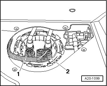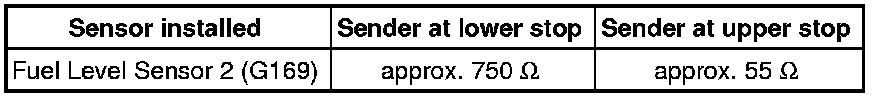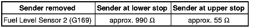 • To check resistance values "tank full" or "tank empty", Fuel Level Sensor 2 must be removed, refer to Repair Information and the sensor floater must be placed in upper or lower end position.