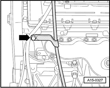 - Remove the oil dipstick guide tube bolt - arrow - and tube.