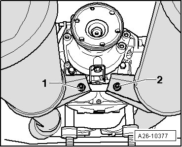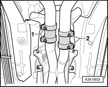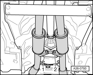 - Remove the nut - 1 - from the bracket and remove the catalytic converter with front muffler.