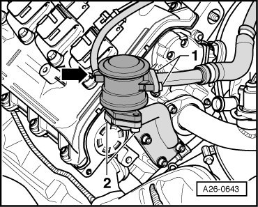 - Remove the bolts - 1 and 2 - and remove the Secondary Air Injection (AIR) combination valve.