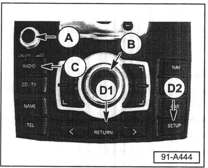 - Press and hold SETUP and RETURN buttons (-arrows D1 and D2-), until MMI screen changes.
