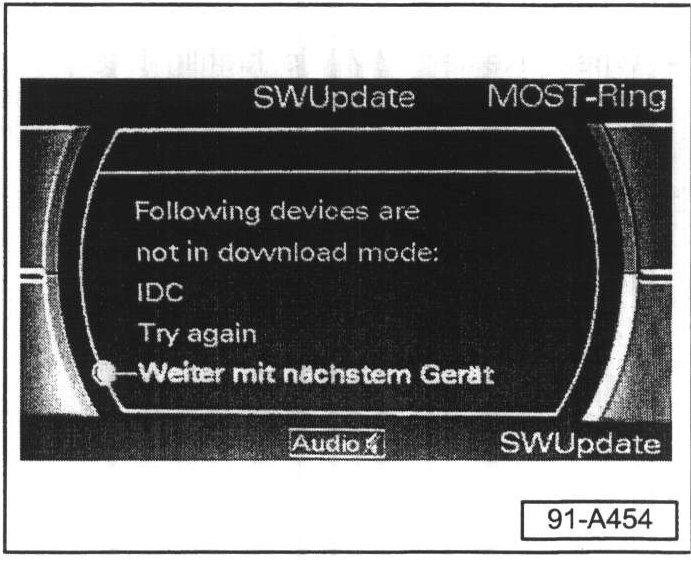 - If error is shown "Device is not in download mode" continue with next device and complete download until you restart MMI. Then start a complete new download process.