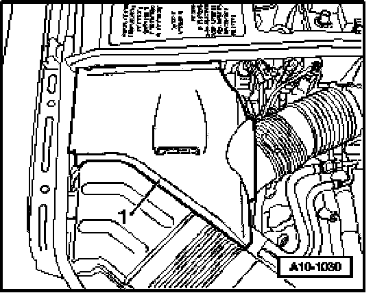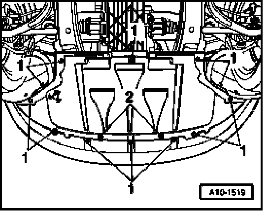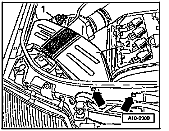- Loosen quick-release fasteners - 1 - , screw out bolts - 2 - and remove noise insulation.