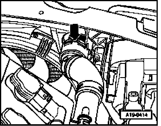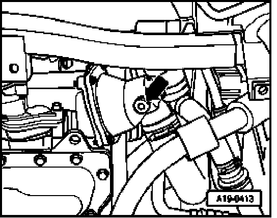 - Remove drain plug - arrow - at housing for thermostat and drain off coolant at engine.