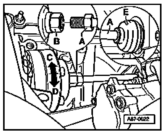 - After loosening threaded connection, drive shaft -A- can be pushed through socket - E- into drive pinion.