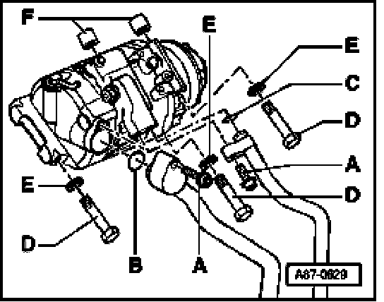 - Install compressor with bolts - D - (and washers - E -) to bracket (tightening torque 25 Nm).
