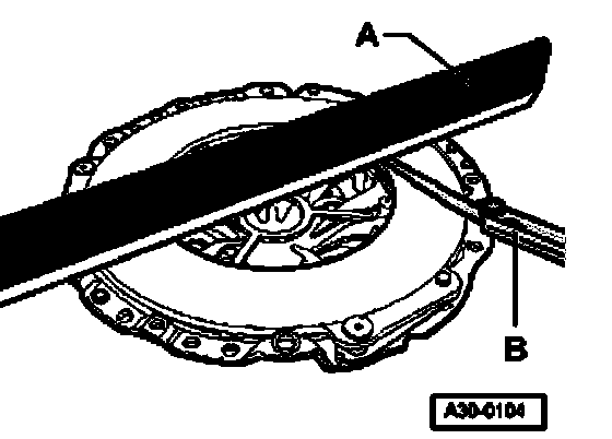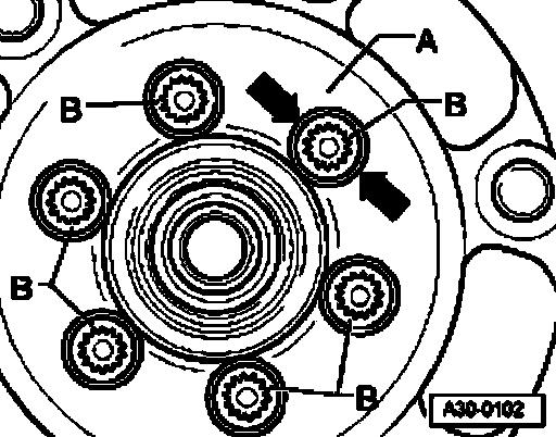 - Rotate flywheel - A - so that bolts - B - are aligned centrally behind the holes - arrows -.
