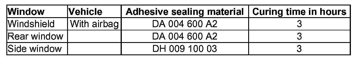 - For safety reasons, use only electrically non-conductive 2C-adhesive when installing windshield and rear window using the materials listed below.
