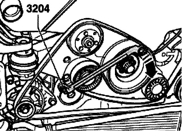 - To loosen ribbed belt, turn belt tensioner with 19 mm wrench in direction of arrow until both holes are aligned. Insert drift 3204 to hold tensioner in position.