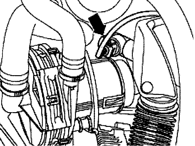 - Remove clamp -arrow- from coolant line and set wiring harness aside.