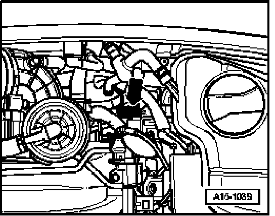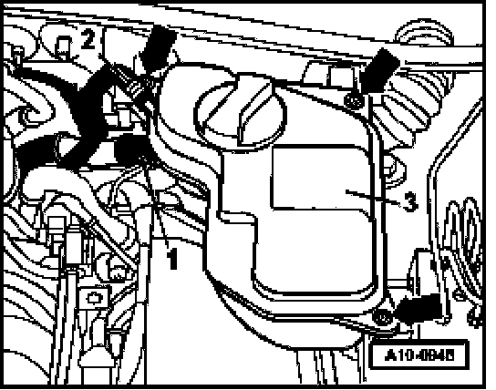 - Camshaft Position (CMP) Sensor -G163- is located at rear of left cylinder head (bank 2). To reach the harness connector, the line to Engine Coolant Level (ECL) Warning Switch at bottom on reservoir must be disconnected, bolts -arrows- of coolant reservoir must be unscrewed and set it aside. Coolant hoses-1- and -2- remain connected.