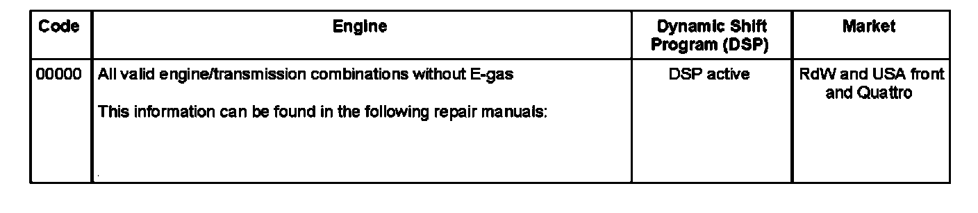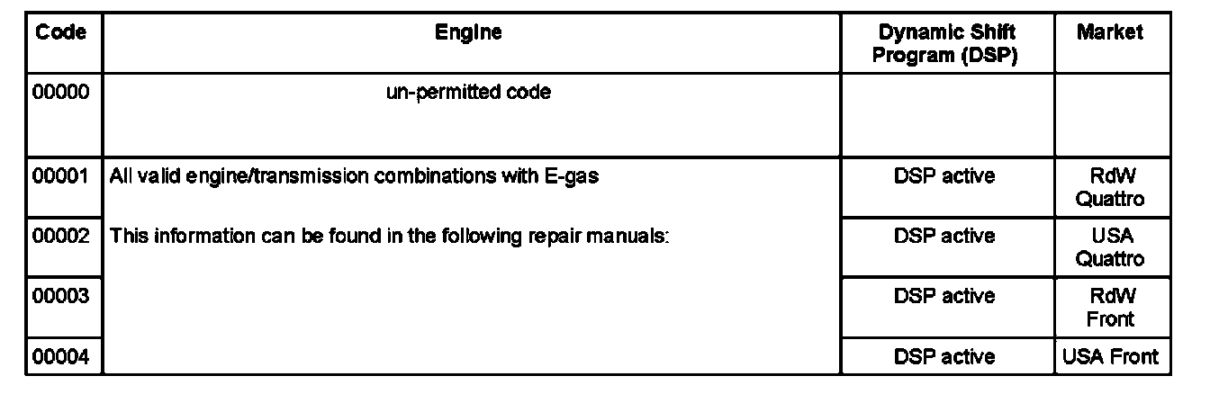 Note: Read Transmission Control Module (TCM) identification to determine which transmission/engine combination is present in this par6cular case, see clarification above. Then use coding table to determine whether the appropriate code is entered.