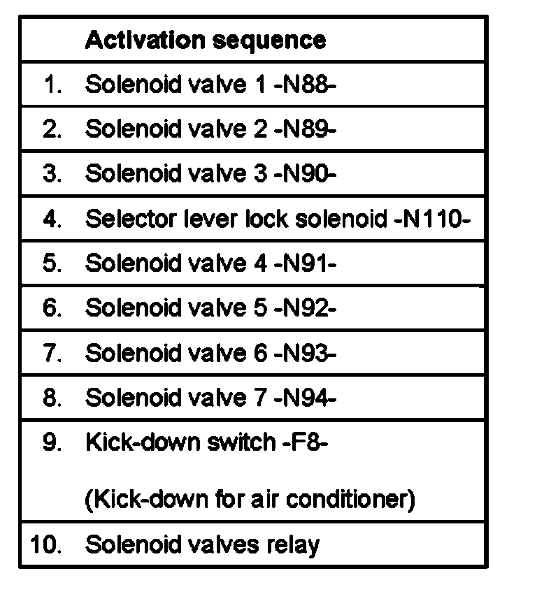 ^ The function of the solenoid valves 1 -N88-, 2 -N89-, 3-N90- and the solenoids for the selector lever lock are checked acoustically during the Output Diagnostic Test Mode. Avoid noise in the surrounding area during the acoustic check, because the switching noise (clicking) of the actuators is very quiet