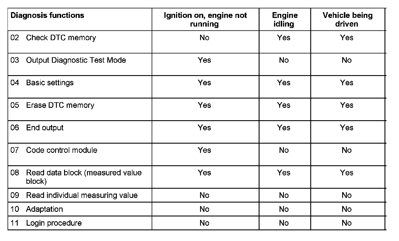 Selectable Functions When Using VAG 1551/1552 or VAS 5051
