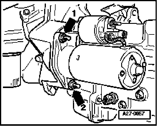 - Remove nut -2- and detach metal bracket -3- from starter securing bolt -4-.