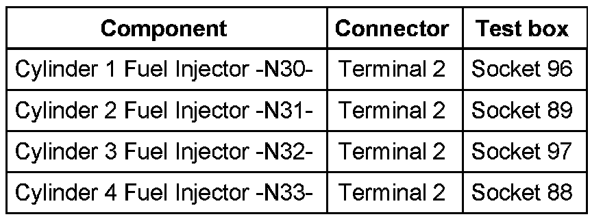 - The respective fuses of fuel injectors (Cylinder 1 Fuel Injector -N30-to Cylinder 4 Fuel Injector -N33-) must be OK.