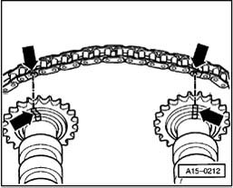 - Clean chain and camshaft sprockets opposite two arrows on bearing caps and mark installed position using colored markings.