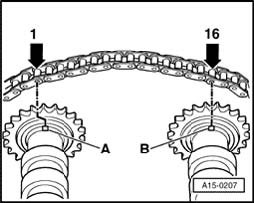 ^ If new chain is installed, distance between notches -A- and -B- on camshafts must be 16 rollers on chain. Illustration shows exact positions of 1st and 16th rollers on sprockets.
