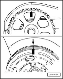- Align marking on camshaft sprocket with marking on cylinder head cover.