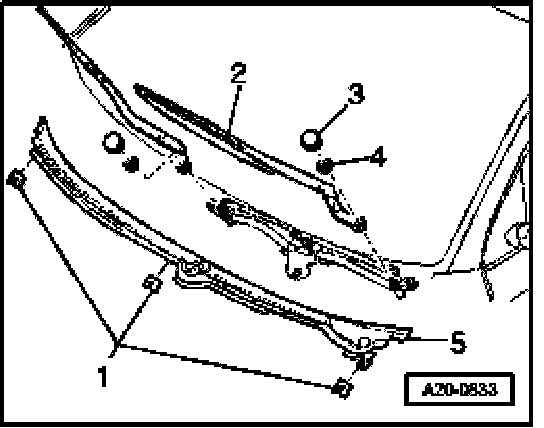 - Disconnect securing clips -1- and remove cowl grill -5-.