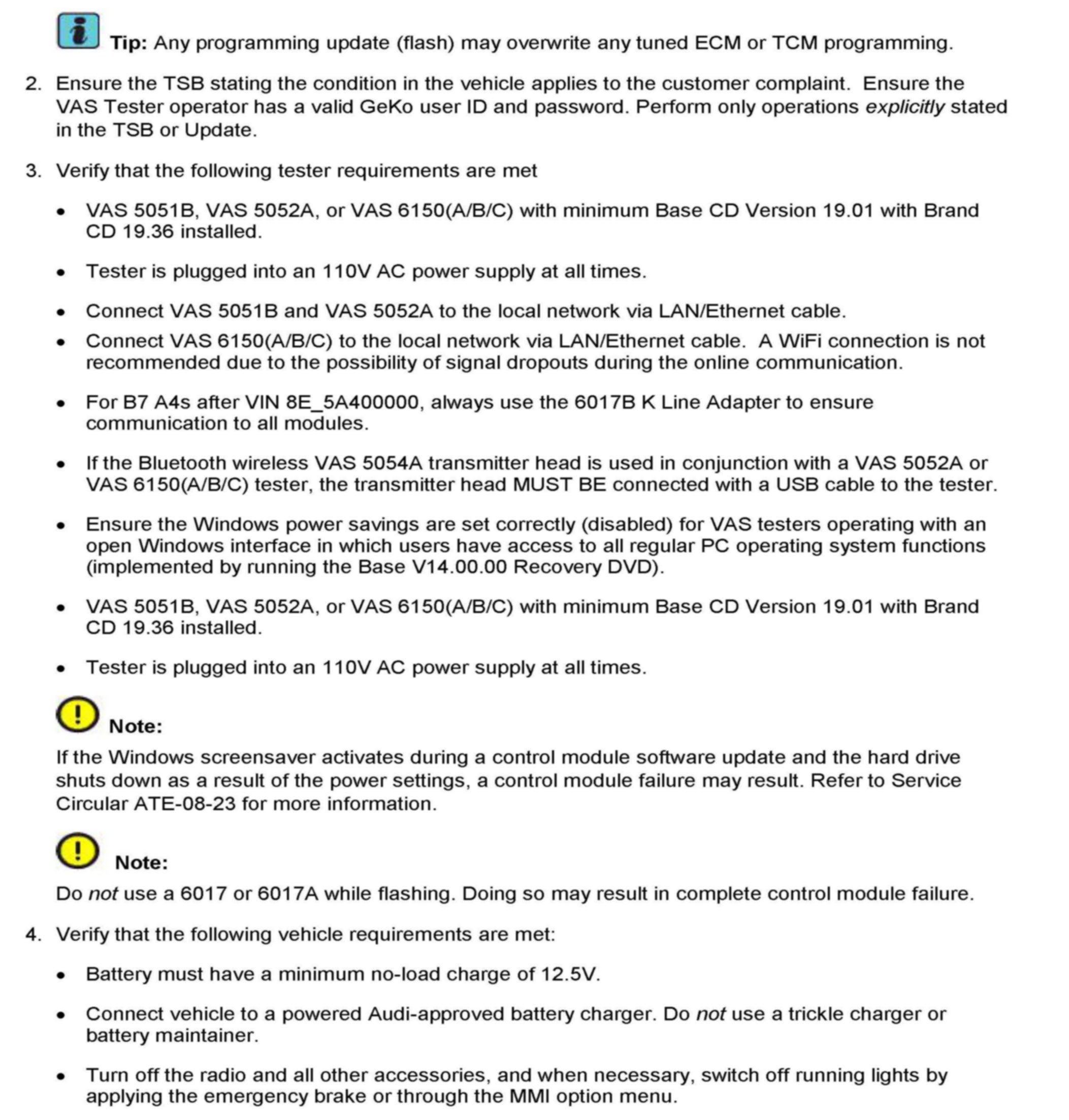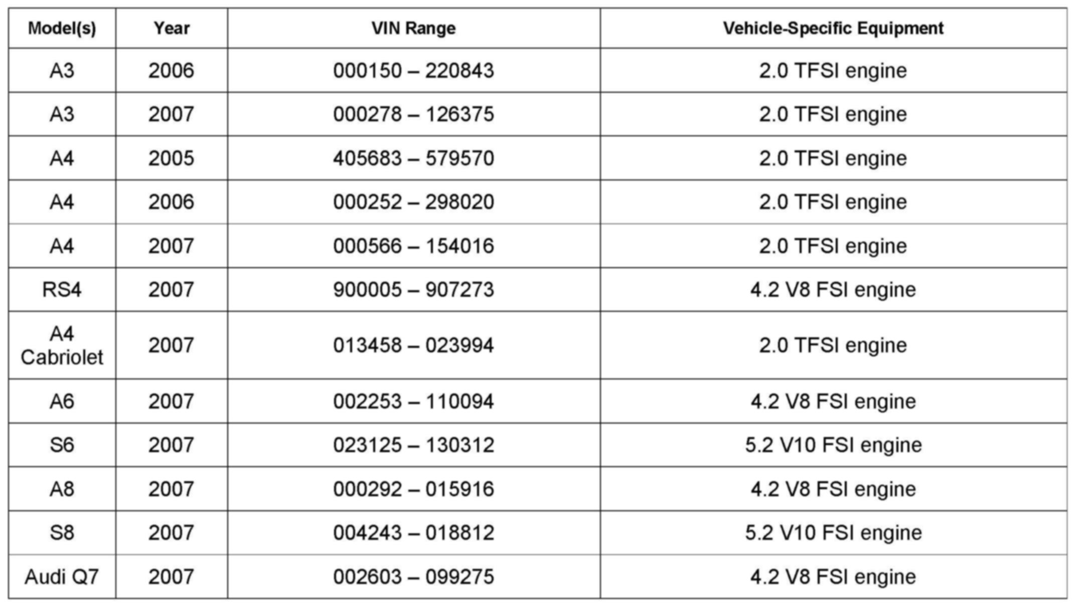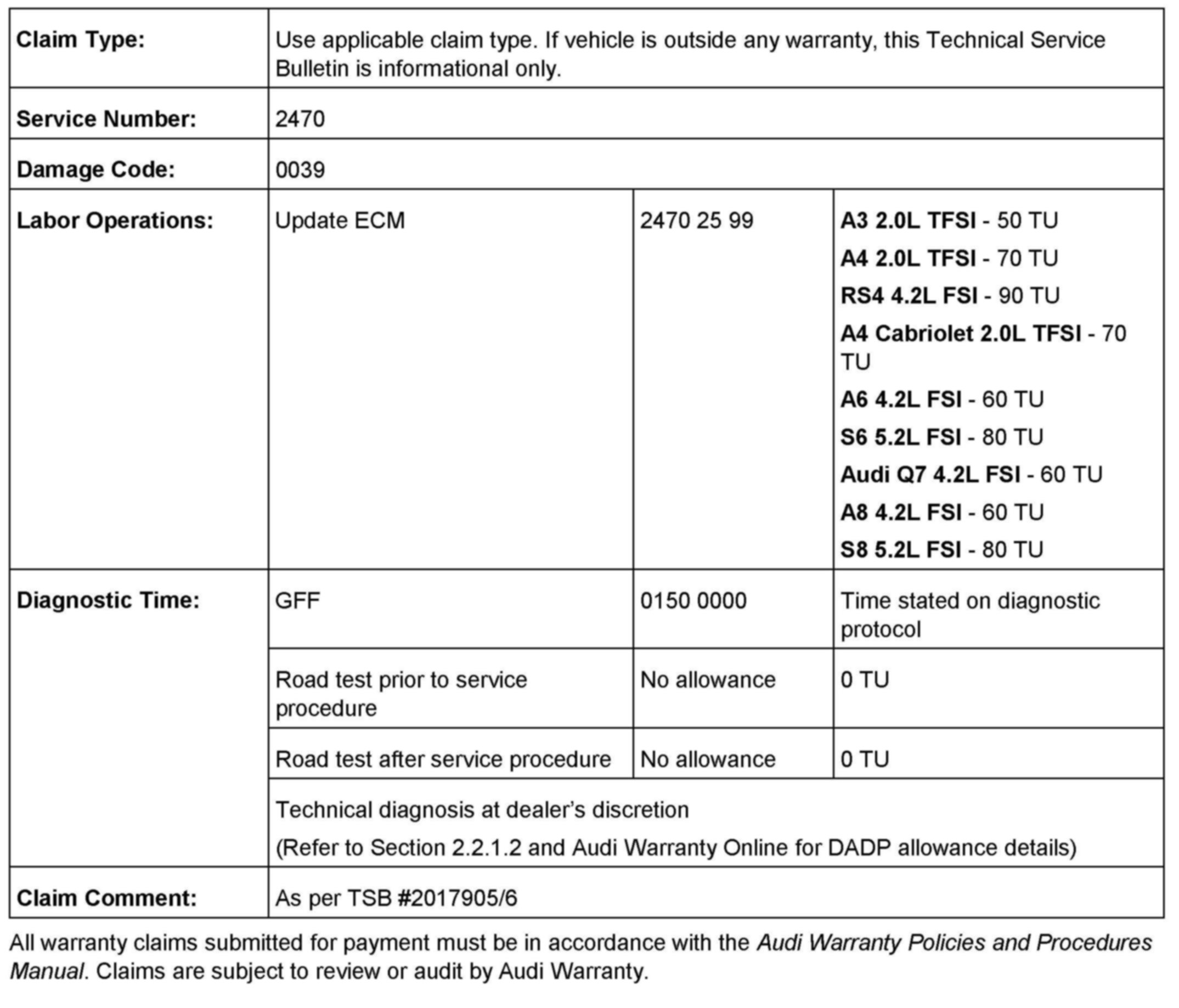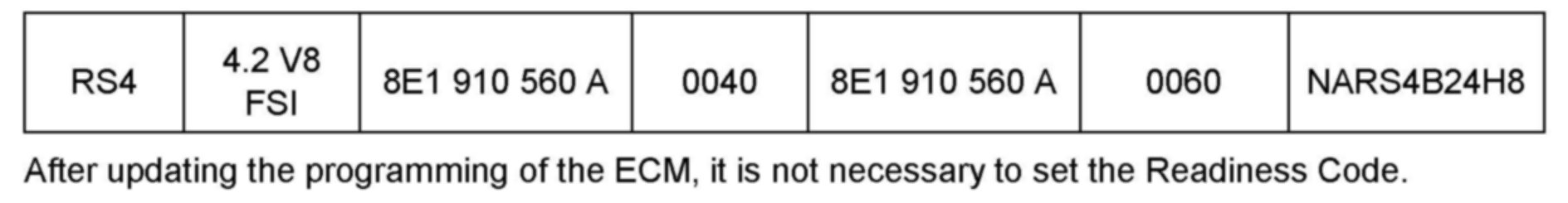 2. Update the ECM software of the affected vehicles (two ECMs for RS4, S6 and S8) using the SVM action codes listed in the table above.