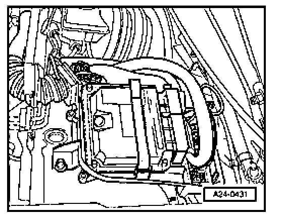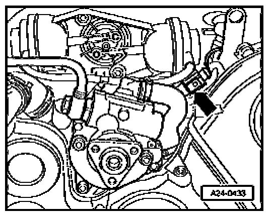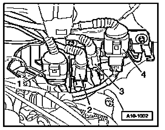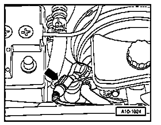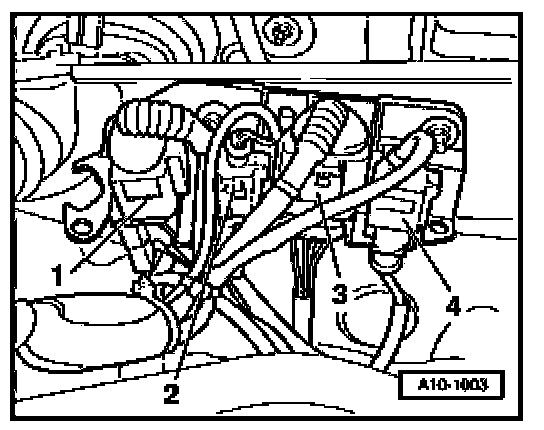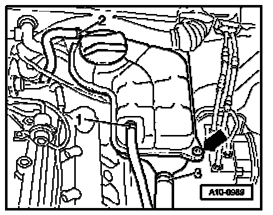 To gain access to the harness connectors, you must remove the cover on left side of engine compartment, disconnect cable to coolant shortage indicator switch at bottom of expansion tank, remove screw for coolant expansion tank (arrow) and lay aside. Coolant hoses -1 to 3- do not have to be disconnected.