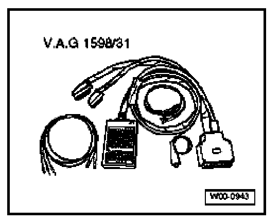 - Connect VAG1598/31 test box to connectors of wiring harness. Connect Ground clamp on test box (not shown in illustration) to vehicle Ground. Whether or not engine control module has to be connected to test box is described in respective test procedures.