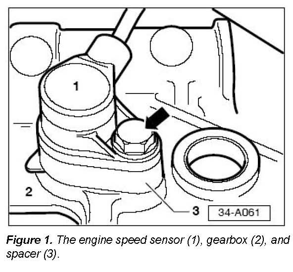Condition may be caused by a spacer (Figure 1, 3) installed between the engine speed (RPM) sensor (G28) (Figure 1, 1) and the gearbox (Figure 1, 2).