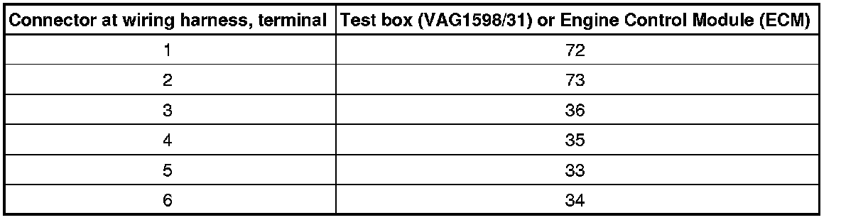 - Connect test box (VAG1598/31) to wiring harness of Engine Control Module (ECM),