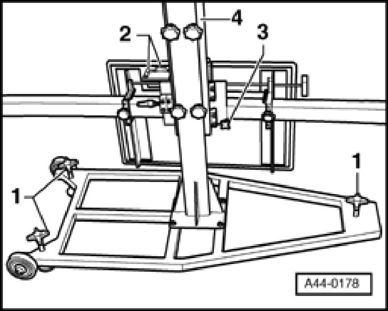- Bring the bubble levels -2- on VAS 6190 into balance using adjustment screws -1-.