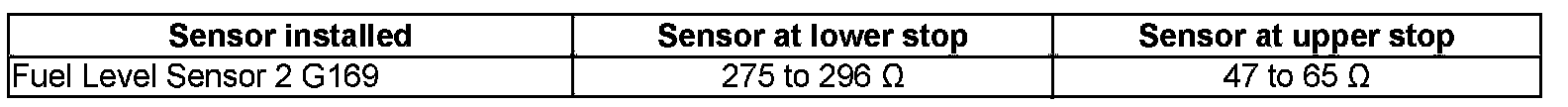 - To check resistance values "tank full" or "tank empty", the Fuel Level Sensor 2 G169 must be removed and the floater of the sensor must be placed in upper or lower end position.